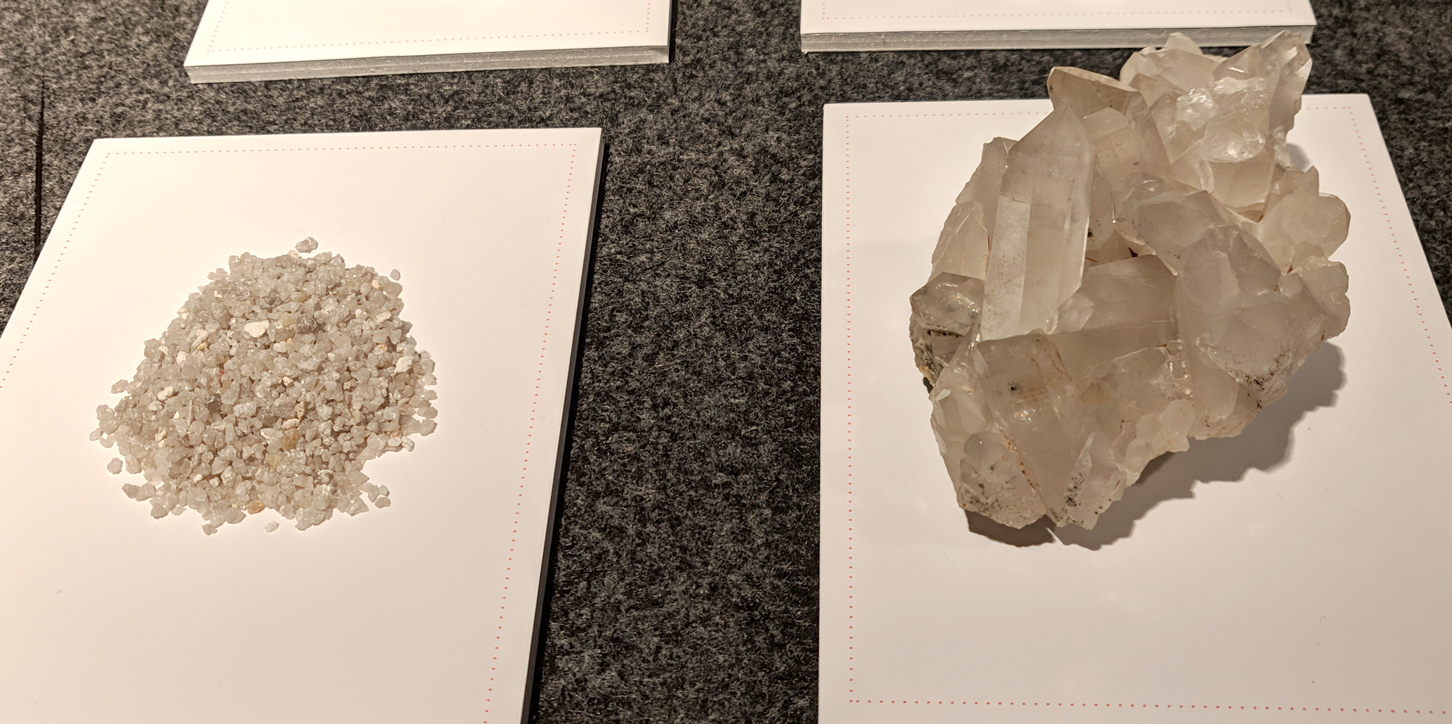 Cuarzo triturado tamaño grava y arena, y cristales de cuarzo hexagonales: