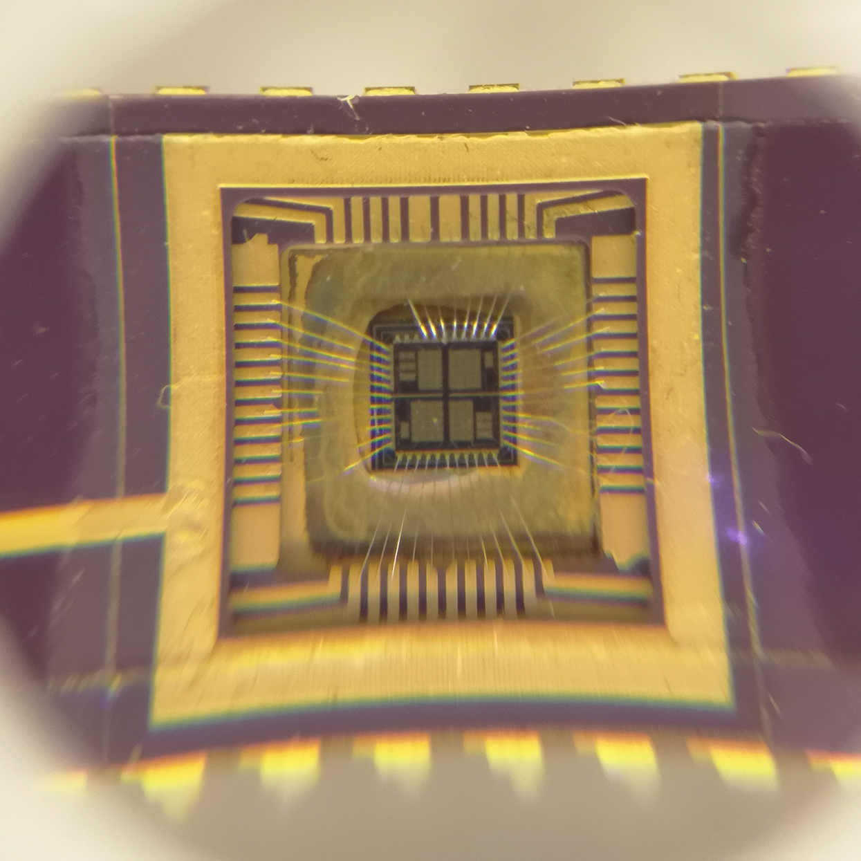 Se pueden observar los cables de interconexión muy finos (wire bonding) desde el chip hasta los contactos del empaquetado de un DIL48 (dual in line, 48 patillas) que contiene un amplificador de instrumentación integrado en tecnología CMOS.
