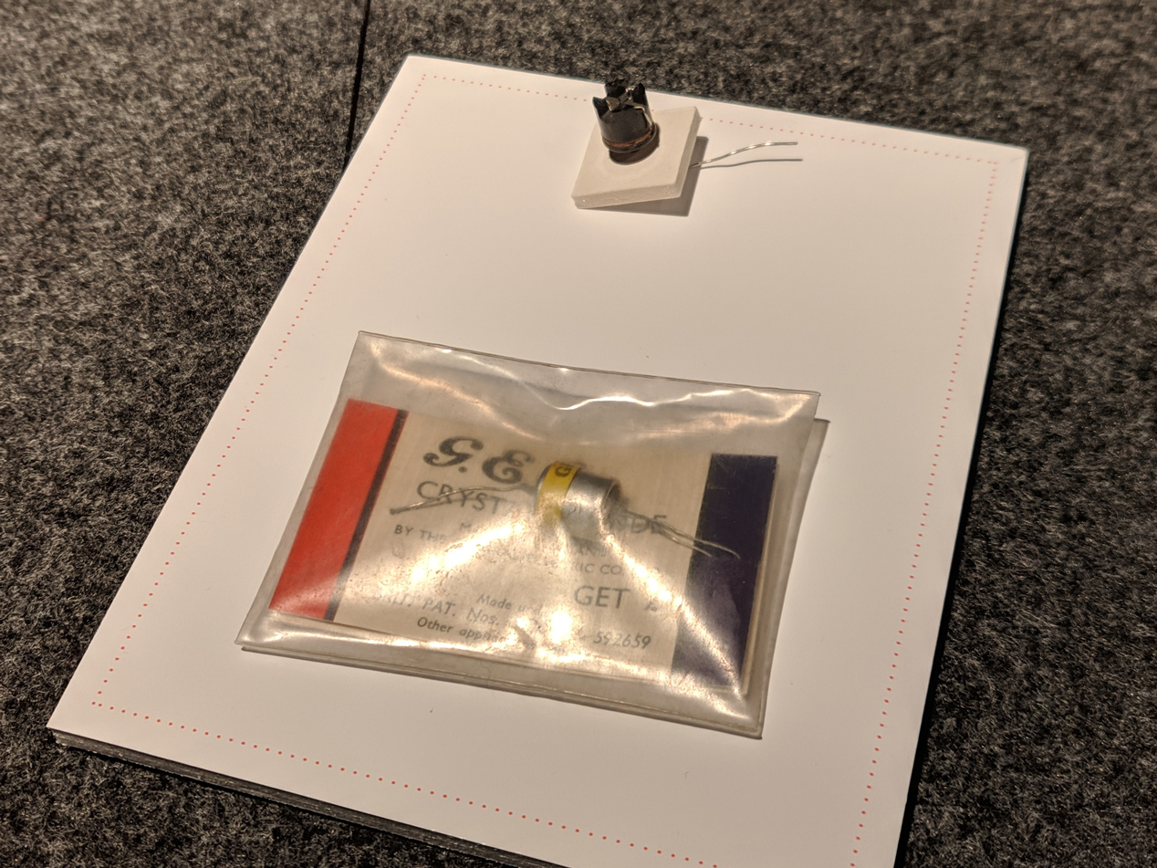 Transistor modelo GET2, de 1954, fabricado por General Electric Company Limited of England (sin relación con General Electric en EEUU) con su paquete original de polietileno sellado que contiene una tarjeta impresa con varios detalles y la descripción “Triodo de Cristal”.
